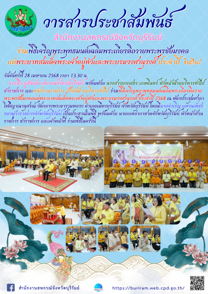วันจันทร์ที่ 28 เมษายน 2568 เวลา 13.30 น. นางวิไล ยูฮันเซ่น สหกรณ์จังหวัดบุรีรัมย์ พร้อมด้วยนางสาวบงกชธร เกษอินทร์ หัวหน้าฝ่ายบริหารทั่วไป ข้าราชการ และพนักงานราชการ สังกัด ฝ่ายบริหารทั่วไป ร่วมพิธีเจริญพระพุทธมนต์เฉลิมพระเกียรติถวายพระพรชัยมงคลแด่พระบาทสมเด็จพระเจ้าอยู่หัวและพระบรมวงศานุวงศ์ ประจำปี 2568 ณ ห้องประชุมศาลาโชติญาณานุสรณ์ วัดกลางพระอารามหลวง อำเภอเมืองบุรีรัมย์ จังหวัดบุรีรัมย์ โดยมีนายจำเริญ แหวนเพ็ชร รองผู้ว่าราชการจังหวัดบุรีรัมย์ เป็นประธานในพิธี พร้อมด้วย นายกเหล่ากาชาดจังหวัดบุรีรัมย์ หัวหน้าส่วนราชการ ข้าราชการ และเจ้าหน้าที่ ร่วมพิธีในครั้งนี้