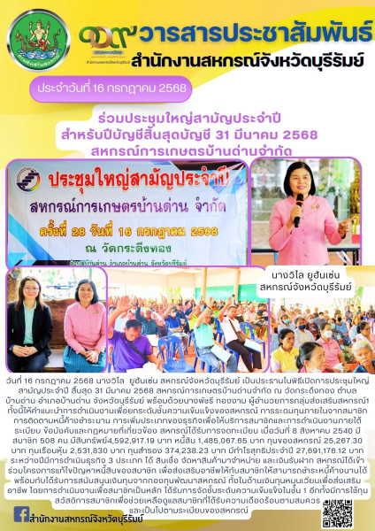 วันที่ 16 กรกฎาคม 2568 นางวิไล ยูฮันเซ่น สหกรณ์จังหวัดบุรีรัมย์ เป็นประธานในพิธีเปิดการประชุมใหญ่สามัญประจำปี สิ้นสุด 31 มีนาคม 2568 สหกรณ์การเกษตรบ้านด่านจำกัด ณ วัดกระดึงทอง ตำบลบ้านด่าน อำเภอบ้านด่าน จังหวัดบุรีรัมย์ พร้อมด้วยนางพัชรี ทองงาม ผู้อำนวยการกลุ่มส่งเสริมสหกรณ์1 ทั้งนี้ให้คำแนะนำการดำเนินงานเพื่อยกระดับชั้นความเข้มเเข็งของสหกรณ์ การระดมทุนภายในจากสมาชิก การติดตามหนี้ค้างชำระนาน การเพิ่มประเภทของธุรกิจเพื่อให้บริการสมาชิกและการดำเนินงานภายใต้ระเบียบ ข้อบังคับและกฎหมายที่เกี่ยวข้อง สหกรณ์ได้รับการจดทะเบียน เมื่อวันที่ 8 สิงหาคม 2540 มีสมาชิก 508 คน ระหว่างปีมีการดำเนินธุรกิจ 3 ประเภท ได้สินเชื่อ จัดหาสินค้ามาจำหน่าย และเงินรับฝาก สหกรณ์ได้เข้าร่วมโครงการแก้ไขปัญหาหนี้สินของสมาชิก เพื่อส่งเสริมอาชีพให้กับสมาชิกให้สามารถชำระหนี้ค้างนานได้ พร้อมกับได้รับการสนับสนุนเงินทุนจากกองทุนพัฒนาสหกรณ์ ทั้งในด้านเงินทุนหมุนเวียนเพื่อส่งเสริมอาชีพ โดยการดำเนินงานเพื่อสมาชิกเป็นหลัก ได้รับการจัดชั้นระดับความเข้มแข็งในชั้น 1 อีกทั้งมีการใช้ทุนสวัสดิการสมาชิกเพื่อช่วยเหลือดูแลสมาชิกที่ได้รับความเดือดร้อนตามสมควร และเป็นไปตามระเบียบของสหกรณ์