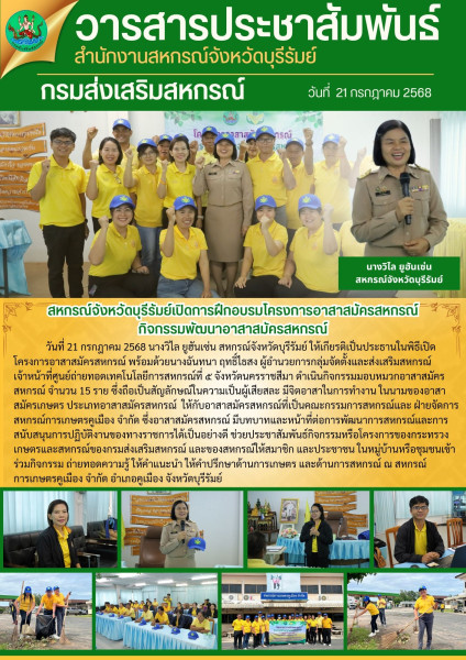 วันที่ 21 กรกฎาคม 2568 นางวิไล ยูฮันเซ่น สหกรณ์จังหวัดบุรีรัมย์ ให้เกียรติเป็นประธานในพิธีเปิดโครงการอาสาสมัครสหกรณ์ พร้อมด้วยนางฉันทนา ฤทธิ์ไธสง ผู้อำนวยการกลุ่มจัดตั้งและส่งเสริมสหกรณ์ เจ้าหน้าที่ศูนย์ถ่ายทอดเทคโนโลยีการสหกรณ์ที่ 5 จังหวัดนครราชสีมา ดำเนินกิจกรรมมอบหมวกอาสาสมัครสหกรณ์ จำนวน 15 ราย ซึ่งถือเป็นสัญลักษณ์ในความเป็นผู้เสียสละ มีจิตอาสาในการทำงาน ในนามของอาสาสมัครเกษตร ประเภทอาสาสมัครสหกรณ์ ให้กับอาสาสมัครสหกรณ์ที่เป็นคณะกรรมการสหกรณ์และ ฝ่ายจัดการสหกรณ์การเกษตรคูเมือง จำกัด ซึ่งอาสาสมัครสหกรณ์ มีบทบาทและหน้าที่ต่อการพัฒนาการสหกรณ์และการสนับสนุนการปฏิบัติงานของทางราชการได้เป็นอย่างดี ช่วยประชาสัมพันธ์กิจกรรมหรือโครงการของกระทรวงเกษตรและสหกรณ์ของกรมส่งเสริมสหกรณ์ และของสหกรณ์ให้สมาชิก และประชาชน ในหมู่บ้านหรือชุมชนเข้าร่วมกิจกรรม ถ่ายทอดความรู้ ให้คำแนะนำ ให้คำปรึกษาด้านการเกษตร และด้านการสหกรณ์ ณ สหกรณ์การเกษตรคูเมือง จำกัด อำเภอคูเมือง จังหวัดบุรีรัมย์