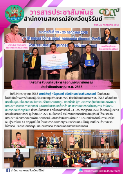 วันที่ 24 กรกฎาคม 2568 นายวิศิษฐ์ ศรีสุวรรณ์ อธิบดีกรมส่งเสริมสหกรณ์ เป็นประธานในพิธีเปิดโครงการสัมมนาผู้บริหารกองทุนพัฒนาสหกรณ์ ประจำปีงบประมาณ พ.ศ. 2568 พร้อมด้วยนางวิไล ยูฮันเซ่น สหกรณ์จังหวัดบุรีรัมย์ นายภาคภูมิ ยอดน้ำคำ ผู้อำนวยการกลุ่มส่งเสริมและพัฒนาการบริหารการจัดการสหกรณ์ และนายชัยขจร แกล้วกล้า นักวิชาการสหกรณ์ชำนาญการ สำนักงานสหกรณ์จังหวัดบุรีรัมย์ เข้าร่วมโครงการ จัดขึ้นระหว่างวันที่ 23 - 25 กรกฎาคม 2568 โดยคณะผู้บริหารกรมส่งเสริมสหกรณ์ ผู้เข้าสัมมนา จำนวน 220 คน เข้าร่วม ณ โรงแรมสุนีย์ แกรนด์ โฮเทล แอนด์ คอนเวนชั่น เซ็นเตอร์ อำเภอเมือง จังหวัดอุบลราชธานี โดยมีวัตถุประสงค์เพื่อติดตามและประเมินผลโครงการ/แผนงานของสหกรณ์ที่ได้รับการสนับสนุนเงินกองทุนพัฒนาสหกรณ์ รวมถึงเพิ่มประสิทธิภาพการบริหารจัดการกองทุนพัฒนาสหกรณ์