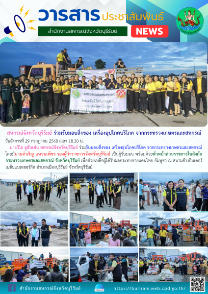 วันอังคารที่ 29 กรกฎาคม 2568 เวลา 18.30 น. นางวิไล ยูฮันเซ่น สหกรณ์จังหวัดบุรีรัมย์ ร่วมรับมอบสิ่งของ เครื่องอุปโภคบริโภค จากกระทรวงเกษตรและสหกรณ์ โดยมีนายจำเริญ แหวนเพ็ชร รองผู้ว่าราชการจังหวัดบุรีรัมย์ เป็นผู้รับมอบ พร้อมด้วยหัวหน้าส่วนราชการในสังกัดกระทรวงเกษตรและสหกรณ์ จังหวัดบุรีรัมย์ เพื่อช่วยเหลือผู้ได้รับผลกระทบชายแดนไทย-กัมพูชา ณ สนามช้างอินเตอร์เนชั่นแนลเซอร์กิต อำเภอเมืองบุรีรัมย์ จังหวัดบุรีรัมย์
