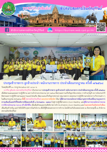 วันพฤหัสบดีที่ ๓๐ กรกฎาคม ๒๕๖๘ เวลา ๐๙.๓๐ น. นางวิไล ยูฮันเซ่น สหกรณ์จังหวัดบุรีรัมย์ เป็นประธานการประชุมข้าราชการ ลูกจ้างประจำ พนักงานราชการ ประจำเดือนกรกฎาคม ครั้งที่ ๗/๒๕๖๘ เพื่อติดตามแผนและผลการปฏิบัติงาน ผลการเบิกจ่ายงบประมาณ พ.ศ. ๒๕๖๘ ติดตามผลการแก้ไขปัญหาข้อบกพร่อง การชำระบัญชี งบการเงินประจำปี ติดตามผลการปฏิบัติงานตามแผนการแนะนำส่งเสริม พัฒนาและแก้ไขปัญหาสหกรณ์ กลุ่มเกษตรกร ตลอดจนการปฏิบัติงานตามโครงการ/กิจกรรมต่าง ๆ ในเดือนกรกฎาคม พ.ศ.๒๕๖๘ ทั้งนี้ สหกรณ์จังหวัดบุรีรัมย์ มอบประกาศนียบัตร ให้แก่ ผู้ที่ผ่านการอบรมโครงการพัฒนาบุคลากรขับเคลื่อนงานบูรณาการความเข้มแข็งและตัวชี้วัดหลักภายใต้แผนระดับที่ ๓ (พ.ศ.๒๕๖๖ - ๒๕๗๐) ไปสู่การปฏิบัติผ่านระบบ Zoom Meetitng และผู้ที่ผ่านการอบรมโครงการอบรมการใช้งานโปรแกรม Canva สร้างสื่อวีดีโอ เพื่อเพิ่มทักษะและประสิทธิภาพการทำงาน ผ่านระบบ Zoom Meetitng และร่วมอวยพรวันเกิดประจำเดือน เพื่อเสริมสร้างขวัญ และกำลังใจให้กับบุคลากรในสำนักงาน เพื่อให้รู้สึกผ่อนคลายจากการทำงาน โดยได้ร่วมกันร้องเพลงอวยพร ณ ห้องประชุมชั้น ๒ สำนักงานสหกรณ์จังหวัดบุรีรัมย์
