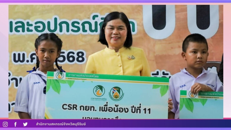 วันพฤหัสบดี ที่ 31 กรกฎาคม 2568 เวลา 09.00 น. นางวิไล ยูฮันเซ่น สหกรณ์จังหวัดบุรีรัมย์ พร้อมด้วยนายวิทยา มัยสนิท นักวิชาการสหกรณ์ชำนาญการ ร่วมเป็นเกียรติในพิธีมอบทุนการศึกษา โครงการความรับผิดชอบต่อสังคม (CSR) ณ โรงเรียนบ้านกระทุ่มเครือ หมู่ที่ 8 บ้านกระทุ่มเครือ ตำบลแคนดง อำเภอแคนดง จังหวัดบุรีรัมย์ โดยมี ดร.เพิก เลิศวังพง รักษาการแทน ผู้ว่าการยางแห่งประเทศไทย เป็นประธานในพิธี และผู้อำนวยการการยางแห่งประเทศไทยเขตภาคตะวันออกเฉียงเหนือตอนล่าง กล่าวรายงาน พร้อมด้วย นายณัฐพล แป้นนอก ผู้ตรวจราชการกรมส่งเสริมสหกรณ์ เขตตรวจราชการที่ 11 , 13 และ 14 หัวหน้าส่วนราชการในจังหวัดและในพื้นที่เข้าร่วมในครั้งนี้ ทั้งนี้ มีวัตถุประสงค์ของการมอบทุนการศึกษา CSR เพื่อน้องปีที่ 11 เพื่อเป็นการส่งเสริมการศึกษาบุตรหลานของเกษตรกรชาวสวนยางที่เรียนดี ฐานะยากจน และประพฤติดี กิจกรรมเด่นในสถานศึกษาต่อไป