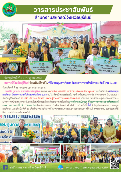 สหกรณ์จังหวัดบุรีรัมย์ ร่วมเป็นเกียรติในพิธี มอบทุนการศึกษาโครงการความรับผิดชอบต่อสังคม (CSR)