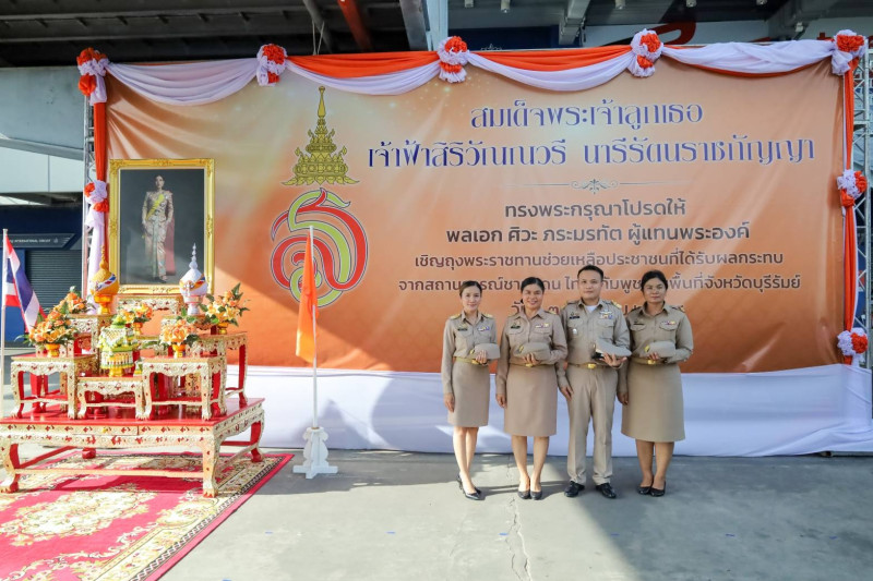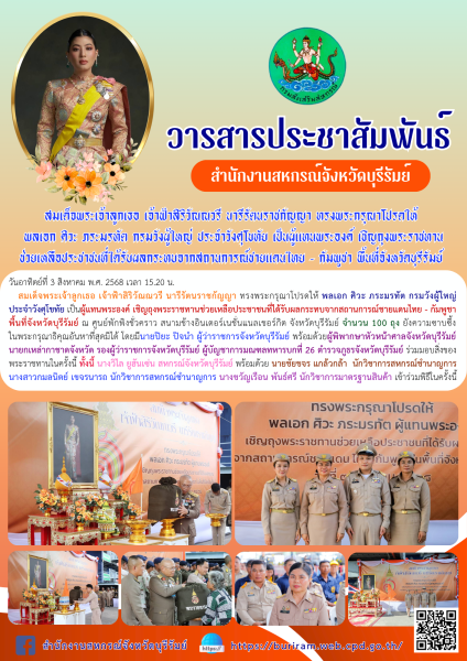 วันอาทิตย์ที่ 3 สิงหาคม พ.ศ. 2568 เวลา 15.20 น. สมเด็จพระเจ้าลูกเธอ เจ้าฟ้าสิริวัณณวรี นารีรัตนราชกัญญา ทรงพระกรุณาโปรดให้ พลเอก ศิวะ ภระมรทัต กรมวังผู้ใหญ่ ประจำวังศุโขทัย เป็นผู้แทนพระองค์ เชิญถุงพระราชทานช่วยเหลือประชาชนที่ได้รับผลกระทบจากสถานการณ์ชายแดนไทย - กัมพูชา พื้นที่จังหวัดบุรีรัมย์ ณ ณ ศูนย์พักพิงชั่วคราว สนามช้างอินเตอร์เนชั่นแนลเชอร์กิต จังหวัดบุรีรัมย์ จำนวน 100 ถุง ยังความซาบซึ้ง ในพระกรุณาธิคุณอันหาที่สุดมิได้ โดยมีนายปิยะ ปิจนำ ผู้ว่าราชการจังหวัดบุรีรัมย์ พร้อมด้วยผู้พิพากษาหัวหน้าศาลจังหวัดบุรีรัมย์ นายกเหล่ากาชาดจังหวัด รองผู้ว่าราชการจังหวัด ผู้บัญชาการมณฑลทหารบกที่ 26 ตำรวจภูธรจังหวัดบุรีรัมย์ ร่วมมอบสิ่งของพระราชทานในครั้งนี้ ทั้งนี้ นางวิไล ยูฮันเซ่น สหกรณ์จังหวัดบุรีรัมย์ พร้อมด้วยข้าราชการ และพนักงานราชการ สำนักงานสหกรณ์จังหวัดบุรีรัมย์ เข้าร่วมพิธีในครั้งนี้