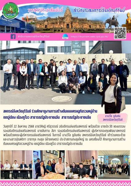 วันศุกร์ที่ 22 สิงหาคม 2568 นายวิศิษฐ์ ศรีสุวรรณ์ อธิบดีกรมส่งเสริมสหกรณ์ พร้อมด้วย นายประวัติ แดงบรรจง รองอธิบดีกรมส่งเสริมสหกรณ์ นายสันทาน สีสา รองอธิบดีกรมส่งเสริมสหกรณ์ ผู้บริหารกองทุนพัฒนาสหกรณ์ พร้อมด้วยคณะผู้บริหารกรมส่งเสริมสหกรณ์ ในการนี้ นางวิไล ยูฮันเซ่น สหกรณ์จังหวัดบุรีรัมย์ เข้าร่วมคณะด้วย และนางสาวปุณฑริกา ฉายากุล กงสุล (ฝ่ายเกษตร) ประจำสถานกงสุลใหญ่ ณ นครเซี่ยงไฮ้ ศึกษาดูงานการสร้างต้นแบบเศรษฐกิจรวมหมู่บ้าน เขตอู่เจียง เมืองซูโจว สาธารณรัฐประชาชนจีน
