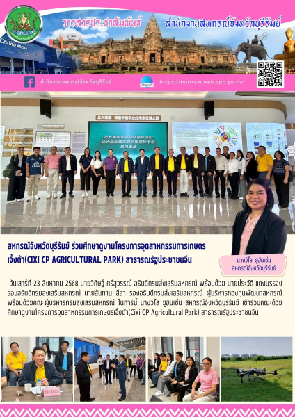วันเสาร์ที่ 23 สิงหาคม 2568 นายวิศิษฐ์ ศรีสุวรรณ์ อธิบดีกรมส่งเสริมสหกรณ์ พร้อมด้วย นายประวัติ แดงบรรจง รองอธิบดีกรมส่งเสริมสหกรณ์ นายสันทาน สีสา รองอธิบดีกรมส่งเสริมสหกรณ์ ผู้บริหารกองทุนพัฒนาสหกรณ์ พร้อมด้วยคณะผู้บริหารกรมส่งเสริมสหกรณ์ ในการนี้ นางวิไล ยูฮันเซ่น สหกรณ์จังหวัดบุรีรัมย์ เข้าร่วมคณะด้วย ศึกษาดูงานโครงการอุตสาหกรรมการเกษตรเจิ้งต้า(Cixi CP Agricultural Park) สาธารณรัฐประชาชนจีน