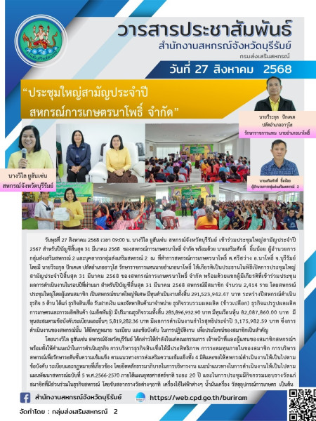 วันพุธที่ 27 สิงหาคม 2568 เวลา 09.00 น. นางวิไล ยูฮันเซ่น สหกรณ์จังหวัดบุรีรัมย์ เข้าร่วมประชุมใหญ่สามัญประจำปี 2567 สำหรับปีบัญชีสิ้นสุด 31 มีนาคม 2568 ของสหกรณ์การเกษตรนาโพธิ์ จำกัด พร้อมด้วย