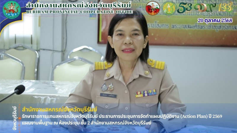 วันจันทร์ ที่ 20 ตุลาคม 2568 เวลา 13.00 น. นางฉันทนา ฤทธิ์ไธสง นักวิชาการสหกรณ์ชำนาญการพิเศษ รักษาราชการแทนสหกรณ์จังหวัดบุรีรัมย์ เป็นประธานการประชุมการจัดทำแผนปฏิบัติงาน (Action Plan) ปี 2569 แผนงานพื้นฐาน ในครั้งนี้มีข้าราชการ ลูกจ้างประจำ และพนักงานราชการ เข้าร่วมประชุมเพื่อชี้แจงแนวทางในการจัดทำแผนปฏิบัติงานประจำปี 2569 (Action Plan) แผนงานพื้นฐาน พร้อมทั้งมอบนโยบายในการปฏิบัติงานสำหรับปีงบประมาณ พ.ศ. 2569 เพื่อให้การบริหารงานภายในสำนักงานสหกรณ์จังหวัดบุรีรัมย์ เป็นไปด้วยความเรียบร้อยและสอดคล้องกับแผนงาน/โครงการ และงบประมาณรายจ่ายประจำปี 2569 ณ ห้องประชุม ชั้น 2 สำนักงานสหกรณ์จังหวัดบุรีรัมย์