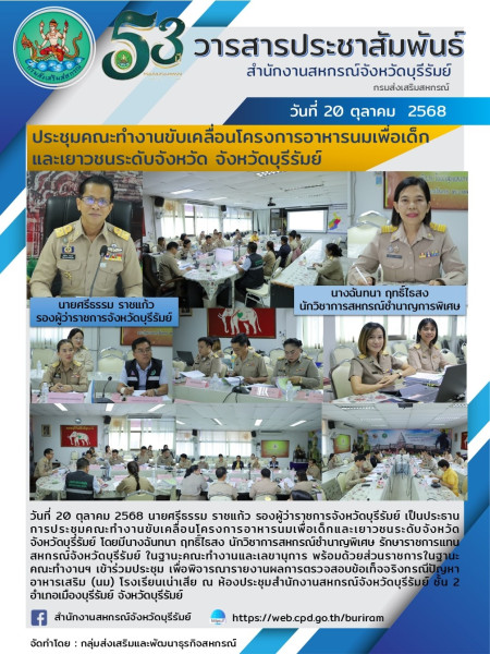 วันจันทร์ที่ 20 ตุลาคม 2568 นายศรีธรรม ราชแก้ว รองผู้ว่าราชการจังหวัดบุรีรัมย์ เป็นประธานการประชุมคณะทำงานขับเคลื่อนโครงการอาหารนมเพื่อเด็กและเยาวชนระดับจังหวัด จังหวัดบุรีรัมย์ โดยมีนางฉันทนา ฤทธิ์ไธสง นักวิชาการสหกรณ์ชำนาญพิเศษ รักษาราชการแทนสหกรณ์จังหวัดบุรีรัมย์ ในฐานะคณะทำงานและเลขานุการ พร้อมด้วยส่วนราชการในฐานะคณะทำงานฯ เข้าร่วมประชุม เพื่อพิจารณารายงานผลการตรวจสอบข้อเท็จจริงกรณีปัญหาอาหารเสริม (นม) โรงเรียนเน่าเสีย ณ ห้องประชุมสำนักงานสหกรณ์จังหวัดบุรีรัมย์ ชั้น 2 อำเภอเมืองบุรีรัมย์ จังหวัดบุรีรัมย์