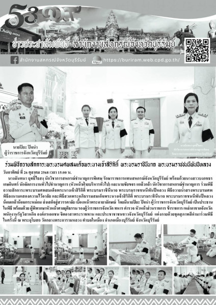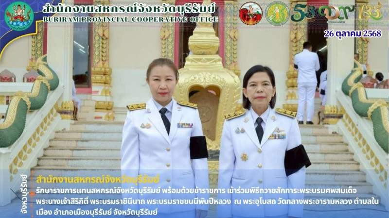 วันอาทิตย์ที่ 26 ตุลาคม 2568 เวลา15.00 น. นางฉันทนา ฤทธิ์ไธสง นักวิชาการสหกรณ์ชำนาญการพิเศษ รักษาราชการแทนสหกรณ์จังหวัดบุรีรัมย์ พร้อมด้วยนางสาวบงกชธร เกษอินทร์ นักจัดการงานทั่วไปชำนาญการ (หัวหน้าฝ่ายบริหารทั่วไป) และนายชัยขจร แกล้วกล้า นักวิชาการสหกรณ์ชำนาญการ ร่วมพิธีถวายสักการะพระบรมศพสมเด็จพระนางเจ้าสิริกิติ์ พระบรมราชินีนาถ พระบรมราชชนนีพันปีหลวง พิธีถวายน้ำสรงพระบรมศพ พิธีลงนามแสดงความไว้อาลัย และพิธีสวดพระอภิธรรมสมเด็จพระนางเจ้าสิริกิติ์ พระบรมราชินีนาถ พระบรมราชชนนีพันปีหลวง น้อมเกล้าน้อมกระหม่อม ส่งเสด็จสู่สวรรคาลัย เบื้องหน้าพระฉายาลักษณ์ โดยมีนายปิยะ ปิจนำ ผู้ว่าราชการจังหวัดบุรีรัมย์ เป็นประธานในพิธี พร้อมด้วย ผู้พิพากษาหัวหน้าศาลยุติธรรม รองผู้ว่าราชการจังหวัด ทหาร ตำรวจ หัวหน้าส่วนราชการ ข้าราชการ เหล่ากาชาดจังหวัด พนักงานรัฐวิสาหกิจ องค์กรเอกชน จิตอาสาพระราชทาน และประชาชาชนชาวจังหวัดบุรีรัมย์ แต่งกายด้วยชุดสุภาพสีดำมาร่วมพิธีในครั้งนี้ ณพระอุโบสถ วัดกลางพระอารามหลวง ตำบลในเมือง อำเภอเมืองบุรีรัมย์ จังหวัดบุรีรัมย์