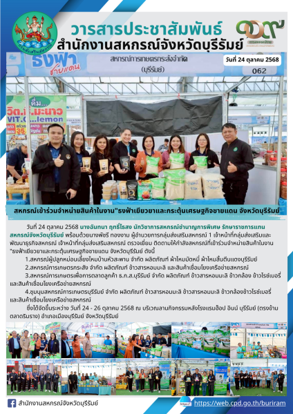 วันที่ 24 ตุลาคม 2568 เวลา 10.00 น. นางฉันทนา ฤทธิ์ไธสง นักวิชาการสหกรณ์ชำนาญการพิเศษ รักษาราชการแทน สหกรณ์จังหวัดบุรีรัมย์ พร้อมด้วยนางพัชรี ทองงาม ผู้อำนวยการกลุ่มส่งเสริมสหกรณ์ 1 เจ้าหน้าที่กลุ่มส่งเสริมและพัฒนาธุรกิจสหกรณ์ เจ้าหน้าที่กลุ่มส่งเสริมสหกรณ์ ตรวจเยี่ยม ติดตามให้กำลังสหกรณ์ที่เข้าร่วมจำหน่ายสินค้าในงาน "ธงฟ้าเยียวยาและกระตุ้นเศรษฐกิจชายแดน จังหวัดบุรีรัมย์ ดังนี้