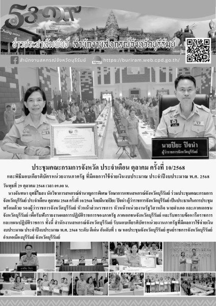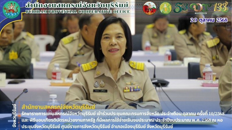 วันพุธที่ 29 ตุลาคม 2568 เวลา 09.00 น. นางฉันทนา ฤทธิ์ไธสง นักวิชาการสหกรณ์ชำนาญการพิเศษ รักษาราชการแทนสหกรณ์จังหวัดบุรีรัมย์ เข้าร่วมประชุมคณะกรมการจังหวัดบุรีรัมย์ ประจำเดือน ตุลาคม 2568 ครั้งที่ 10/2568 โดยมีนายปิยะ ปิจนำ ผู้ว่าราชการจังหวัดบุรีรัมย์ เป็นประธานในการประชุม พร้อมด้วย รองผู้ว่าราชการจังหวัดบุรีรัมย์ หัวหน้าส่วนราชการ หัวหน้าหน่วยงานรัฐวิสาหกิจ นายอำเภอ และภาคเอกชนจังหวัดบุรีรัมย์ เพื่อรับฟังรายงานผลการปฏิบัติราชการของภาครัฐ ภาคเอกชนจังหวัดบุรีรัมย์ และรับทราบข้อหารือราชการและแผนปฏิบัติราชการ ทั้งนี้ สำนักงานสหกรณ์จังหวัดบุรีรัมย์ รับมอบเกียรติบัตรหน่วยงานภาครัฐที่มีผลการใช้จ่ายเงินงบประมาณ ประจำปีงบประมาณ พ.ศ. 2568 ระดับดีเด่น อันดับที่ 1 ณ หอประชุมจังหวัดบุรีรัมย์ ศูนย์ราชการจังหวัดบุรีรัมย์ อำเภอเมืองบุรีรัมย์ จังหวัดบุรีรัมย์