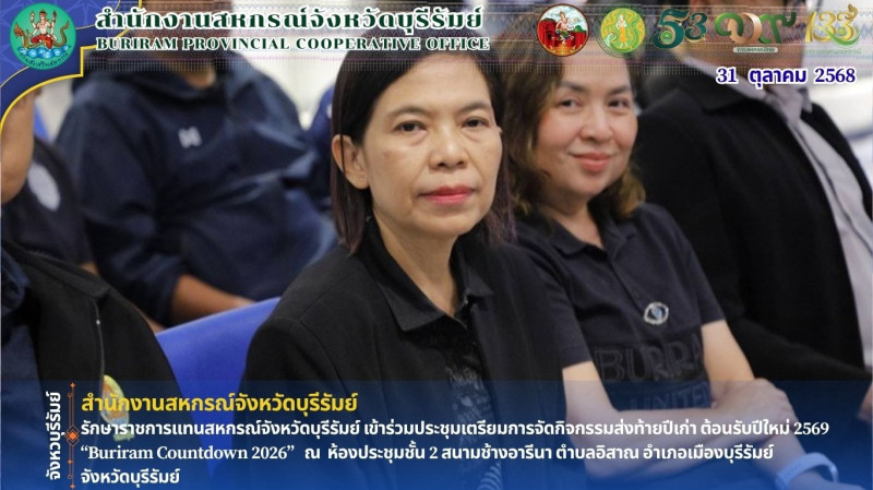 วันศุกร์ที่ 31 ตุลาคม 2568 เวลา 09.00 น. นางฉันทนา ฤทธิ์ไธสง นักวิชาการสหกรณ์ชำนาญการพิเศษ รักษาราชการแทนสหกรณ์จังหวัดบุรีรัมย์ ร่วมประชุมเตรียมการจัดกิจกรรมส่งท้ายปีเก่า ต้อนรับปีใหม่ 2569 “Buriram Countdown 2026” ณ ห้องประชุมชั้น 2 สนามช้างอารีนา ตำบลอิสาณ อำเภอเมืองบุรีรัมย์ จังหวัดบุรีรัมย์ โดยมีนายปิยะ ปิจนำ ผู้ว่าราชการจังหวัดบุรีรัมย์ พร้อมด้วย นายเนวิน ชิดชอบ ประธานสโมสรบุรีรัมย์ยูไนเต็ด รองผู้ว่าราชการจังหวัดบุรีรัมย์ ผู้บัญชาการมณฑลทหารบกที่ 26 ผู้บังคับการตำรวจภูธรจังหวัดบุรีรัมย์ หัวหน้าส่วนราชการ ภาคเอกชน องค์การปกครองส่วนท้องถิ่น ประชุมคณะทำงานจัดงานกิจกรรมส่งท้ายปีเก่า ต้อนรับปีใหม่ 2569 “Buriram Countdown 2026 เพื่อหารือแนวทางการจัดงานให้เป็นไปด้วยความเรียบร้อย เหมาะสม และให้ประชาชนและนักท่องเที่ยวได้ร่วมน้อมรำลึกในพระมหากรุณาธิคุณอันหาที่สุดมิได้ ของสมเด็จพระนางเจ้าสิริกิติ์ พระบรมราชินีนาถ พระบรมราชชนนีพันปีหลวง ในด้างต่างๆ โดยเฉพาะพระราชกรณียกิจด้านการส่งเสริมศิลปาชีพ การทอผ้าไหมที่ทำให้ชาวบุรีรัมย์ มีชีวิตความเป็นอยู่ที่ดีขึ้น