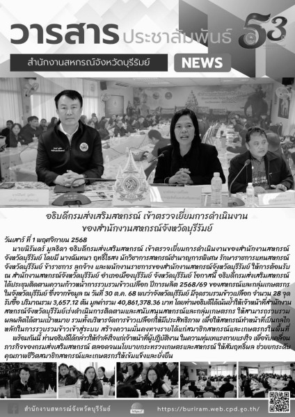วันเสาร์ ที่ 1 พฤศจิกายน 2568 นายนิรันดร์ มูลธิดา อธิบดีกรมส่งเสริมสหกรณ์ เข้าตรวจเยี่ยมการดำเนินงานของสำนักงานสหกรณ์จังหวัดบุรีรัมย์ โดยมี นางฉันทนา ฤทธิ์ไธสง นักวิชาการสหกรณ์ชำนาญการพิเศษ รักษาราชการแทนสหกรณ์จังหวัดบุรีรัมย์ ข้าราชการ ลูกจ้าง และพนักงานราชการของสำนักงานสหกรณ์จังหวัดบุรีรัมย์ ให้การต้อนรับ ณ สำนักงานสหกรณ์จังหวัดบุรีรัมย์ อำเภอเมืองบุรีรัมย์ จังหวัดบุรีรัมย์ โอกาสนี้ อธิบดีกรมส่งเสริมสหกรณ์ ได้ประชุมติดตามความก้าวหน้าการรวบรวมข้าวเปลือก ปีการผลิต 2568/69 ของสหกรณ์และกลุ่มเกษตรกรในจังหวัดบุรีรัมย์ ซึ่งจากข้อมูล ณ วันที่ 30 ต.ค. 68 พบว่าจังหวัดบุรีรัมย์ มีจุดรวบรวมข้าวเปลือก จำนวน 28 จุดรับซื้อ ปริมาณรวม 3,657.12 ตัน มูลค่ารวม 40,861,378.36 บาท โดยท่านอธิบดีได้เน้นย้ำให้เจ้าหน้าที่ สำนักงานสหกรณ์จังหวัดบุรีรัมย์เร่งดำเนินการติดตามและสนับสนุนสหกรณ์และกลุ่มเกษตรกร ให้สามารถรวบรวมผลผลิตได้ตามเป้าหมาย รวมทั้งบริหารจัดการข้าวเปลือกให้มีประสิทธิภาพ เพื่อให้สหกรณ์ ทำหน้าที่เป็นกลไกหลักในการรวบรวมข้าวเข้าสู่ระบบ สร้างความมั่นคงทางรายได้แก่สมาชิกสหกรณ์และเกษตรกรในพื้นที่ พร้อมกันนี้ ท่านอธิบดีได้กล่าวให้กำลังใจแก่เจ้าหน้าที่ผู้ปฏิบัติงาน