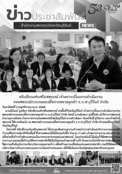 วันอาทิตย์ที่ 2 พฤศจิกายน พ.ศ. 2568 นายนิรันดร์ มูลธิดา อธิบดีกรมส่งเสริมสหกรณ์ ลงพื้นที่จังหวัดบุรีรัมย์ เข้าตรวจเยี่ยมการดำเนินงานของสหกรณ์การเกษตรเพื่อการตลาดลูกค้า ธ.ก.ส.บุรีรัมย์ จำกัด โดยมี นางฉันทนา ฤทธิ์ไธสง นักวิชาการสหกรณ์ชำนาญการพิเศษ รักษาราชการแทนสหกรณ์จังหวัดบุรีรัมย์ นางสาวนิตยา จันทร์ภักดี ผู้จัดการ และเจ้าหน้าที่สหกรณ์ ให้การต้อนรับ ณ สหกรณ์การเกษตรเพื่อการตลาดลูกค้า ธ.ก.ส.บุรีรัมย์ จำกัด อำเภอเมืองบุรีรัมย์ จังหวัดบุรีรัมย์