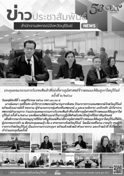 วันพฤหัสบดีที่ ๖ พฤศจิกายน ๒๕๖๘ เวลา ๑๓.๓๐ น. นางฉันทนา ฤทธิ์ไธสง นักวิชาการสหกรณ์ชำนาญการพิเศษ รักษาราชการแทนสหกรณ์จังหวัดบุรีรัมย์ พร้อมด้วยนางพัชรี ทองงาม ผู้อำนวยการกลุ่มส่งเสริมสหกรณ์ ๑ และนายชัยขจร แกล้วกล้า นักวิชาการสหกรณ์ชำนาญการ ร่วมประชุมคณะกรรมการรับรองสินค้าสิ่งบ่งชี้ทางภูมิศาสตร์ข้าวหอมมะลิดินภูเขาไฟบุรีรัมย์ ครั้งที่ ๒/๒๕๖๘ และติดตามให้คำแนะนำในการปฎิบัติสำหรับสมาชิกผู้ขอใช้ตราสัญลักษณ์ เพื่อพิจารณารับรองอนุญาตใช้ตราสัญลักษณ์สิ่งบ่งชี้ทางภูมิศาสตร์ข้าวหอมมะลิดินภูเขาไฟบุรีรัมย์ให้กับผู้ประกอบการค้า ณ ห้องประชุมพนมรุ้ง ชั้น ๔ ศาลากลางจังหวัดบุรีรัมย์ โดยมีนายศรีธรรม ราชแก้ว รองผู้ว่าราชการจังหวัดบุรีรัมย์ เป็นประธานการประชุมฯ พร้อมด้วยหัวหน้าส่วนราชการ และเจ้าหน้าที่ ที่เกี่ยวข้อง เข้าร่วมประชุมในครั้งนี้