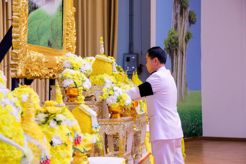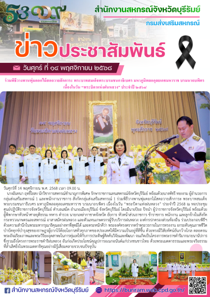 วันศุกร์ที่ 14 พฤศจิกายน พ.ศ. 2568 เวลา 09.00 น. นางฉันทนา ฤทธิ์ไธสง นักวิชาการสหกรณ์ชำนาญการพิเศษ รักษาราชการแทนสหกรณ์จังหวัดบุรีรัมย์ พร้อมด้วยนางพัชรี ทองงาม ผู้อำนวยการกลุ่มส่งเสริมสหกรณ์ 1 และพนักงานราชการ สังกัดกลุ่มส่งเสริมสหกรณ์ 1 ร่วมพิธีวางพานพุ่มดอกไม้สดถวายสักการะ พระบาทสมเด็จพระบรมชนกาธิเบศร มหาภูมิพลอดุลยเดชมหาราช บรมนาถบพิตร เนื่องในวัน “พระบิดาแห่งฝนหลวง” ประจำปี 2568 ณ หอประชุมจังหวัดบุรีรัมย์ ตำบลเสม็ด อำเภอเมืองบุรีรัมย์ จังหวัดบุรีรัมย์ โดยมีนายปิยะ ปิจนำ ผู้ว่าราชการจังหวัดบุรีรัมย์ พร้อมด้วย ผู้พิพากษาหัวหน้าศาลยุติธรรม ทหาร ตำรวจ นายกเหล่ากาชาดจังหวัด อัยการ หัวหน้าส่วนราชการ ข้าราชการ พนักงาน และลูกจ้างในสังกัดกระทรวงเกษตรและสหกรณ์ อาสาสมัครฝนหลวง และตัวแทนเกษตรกรผู้รับบริการฝนหลวง องค์กรปกครองส่วนท้องถิ่น ร่วมประกอบพิธีฯ ด้วยความสำนึกในพระมหากรุณาธิคุณอย่างหาที่สุดมิได้ และตระหนักดีว่า พระองค์ทรงตรากตรำพระวรกายในการทรงงาน ยกระดับคุณภาพชีวิตบำบัดทุกข์บำรุงสุขของราษฎรผู้ยากไร้ด้อยโอกาสทั่วทุกภาคของประเทศให้มีความเป็นอยู่ที่ดีขึ้น ด้วยทรงมีวิสัยทัศน์อันกว้างไกล ตลอดจนพระอัจฉริยะภาพและพระวิริยะอุตสาหะในการทุ่มเทให้กับการประดิษฐ์คิดค้นวิจัยและพัฒนา จนเกิดเป็นโครงการพระราชดำริมากมายนานัปการ ซึ่งรวมถึงโครงการพระราชดำริฝนหลวง อันก่อเกิดประโยชน์คุณูปการอเนกอนันต์แก่ปวงชนชาวไทย ด้วยพระเมตตาธรรมและพระจริยธรรมที่ล้ำเลิศยิ่งในพระเมตตาธิคุณอย่างมิรู้เสื่อมคลายจวบจนปัจจุบัน