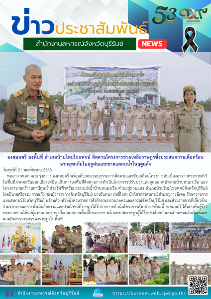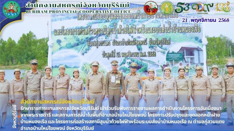 วันศุกร์ที่ 21 พฤศจิกายน 2568 พลอากาศเอก จอม รุ่งสว่าง องคมนตรี พร้อมด้วยคณะอนุกรรมการติดตามและขับเคลื่อนโครงการอันเนื่องมาจากพระราชดำริ ในพื้นที่ภาคตะวันออกเฉียงเหนือ เดินทางลงพื้นที่ติดตามการดำเนินโครงการปรับปรุงและขุดลอกหน้าฝายบ้านหนองเรือ และโครงการก่อสร้างสถานีสูบน้ำด้วยไฟฟ้าพร้อมระบบส่งน้ำบ้านหนองเรือ ตำบลกู่สวนแตง อำเภอบ้านใหม่ไชยพจน์จังหวัดบุรีรัมย์ โดยมีนายศรีธรรม ราชแก้ว รองผู้ว่าราชการจังหวัดบุรีรัมย์ นางฉันทนา ฤทธิ์ไธสง นักวิชาการสหกรณ์ชำนาญการพิเศษ รักษาราชการแทนสหกรณ์จังหวัดบุรีรัมย์ พร้อมด้วยหัวหน้าส่วนราชการสังกัดกระทรวงเกษตรและสกรณ์จังหวัดบุรีรัมย์ และส่วนราชการที่เกี่ยวข้อง ร่วมรายงานผลการดำเนินกิจกรรมและประโยชน์ที่ราษฎรได้รับจากการดำเนินโครงการดังกล่าว พร้อมนี้ องคมนตรี ได้มอบพันธุ์ข้าวพระราชทานให้แก่ผู้แทนเกษตรกร เยี่ยมชมสภาพพื้นที่โครงการฯ พร้อมพบปะราษฎรผู้ได้รับประโยชน์ และเยี่ยมชมผลิตภัณฑ์และผลผลิตการเกษตรของราษฎรในพื้นที่
