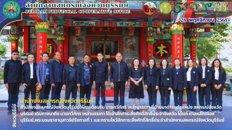 วันศุกร์ที่ 28 พฤศจิกายน พ.ศ. 2568 เวลา 08.39 น. สำนักงานสหกรณ์จังหวัดบุรีรัมย์ให้การต้อนรับ นายทวีภัทร เหล่าบรรเทา ที่ย้ายมาดำรงตำแหน่ง สหกรณ์จังหวัดบุรีรัมย์ ภายหลังเดินทางมาถึง นายทวีภัทร เหล่าบรรเทา ได้เข้าสักการะสิ่งศักดิ์สิทธิ์ประจำจังหวัด ได้แก่ ศาลหลักเมืองบุรีรัมย์,พระบรมราชานุสาวรีย์รัชกาลที่ 1 และกราบไหว้สักการะสิ่งศักดิ์สิทธิ์ประจำสำนักงานสหกรณ์จังหวัดบุรีรัมย์ เพื่อความเป็นสิริมงคลในการเริ่มต้นปฏิบัติราชการในจังหวัดบุรีรัมย์ โดยมีหัวหน้าส่วนราชการ บุคลากรสำนักงานสหกรณ์จังหวัดบุรีรัมย์ และขบวนการสหกรณ์และกลุ่มเกษตรกรในจังหวัดบุรีรัมย์ ร่วมให้การต้อนรับอย่างอบอุ่น