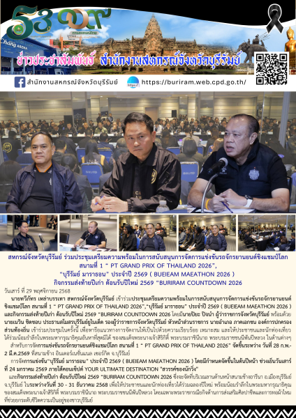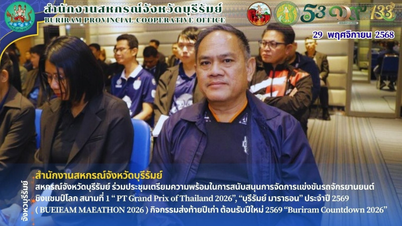 วันเสาร์ที่ 29 พฤศจิกายน 2568 นายทวีภัทร เหล่าบรรเทา สหกรณ์จังหวัดบุรีรัมย์ เข้าร่วมประชุมเตรียมความพร้อมในการสนับสนุนการจัดการแข่งขันรถจักรยานยนต์ชิงแชมป์โลก สนามที่ 1 “ PT Grand Prix of Thailand 2026”, “บุรีรัมย์ มาราธอน” ประจำปี 2569 ( BUEIEAM MAEATHON 2026 ) กิจกรรมส่งท้ายปีเก่า ต้อนรับปีใหม่ 2569 “Buriram Countdown 2026