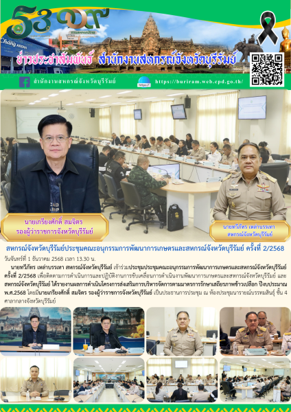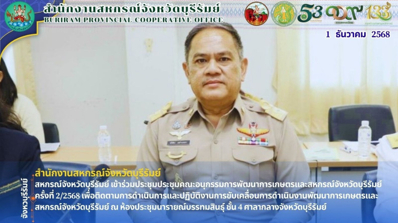 วันจันทร์ที่ 1 ธันวาคม 2568 เวลา 13.30 น. นายทวีภัทร เหล่าบรรเทา สหกรณ์จังหวัดบุรีรัมย์ เข้าร่วมประชุมประชุมคณะอนุกรรมการพัฒนาการเกษตรและสหกรณ์จังหวัดบุรีรัมย์ ครั้งที่ 2/2568 เพื่อติดตามการดำเนินการและปฏิบัติงานการขับเคลื่อนการดำเนินงานพัฒนาการเกษตรและสหกรณ์จังหวัดบุรีรัมย์ และสหกรณ์จังหวัดบุรีรัมย์ได้รายงานผลการดำเนินโครงการส่งเสริมการบริหารจัดการตามมาตรการรักษาเสถียรภาพข้าวเปลือก ปีงบประมาณ พ.ศ.2568 โดยมีนายเกรียงศักดิ์ สมจิตร รองผู้ว่าราชการจังหวัดบุรีรัมย์ เป็นประธานการประชุม ณ ห้องประชุมนารายณ์บรรทมสินธุ์ ชั้น 4 ศาลากลางจังหวัดบุรีรัมย์