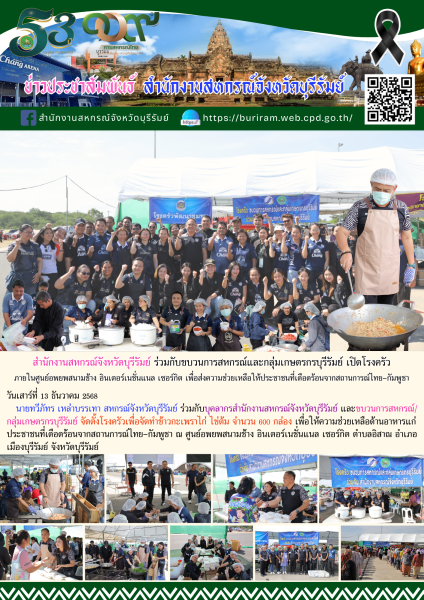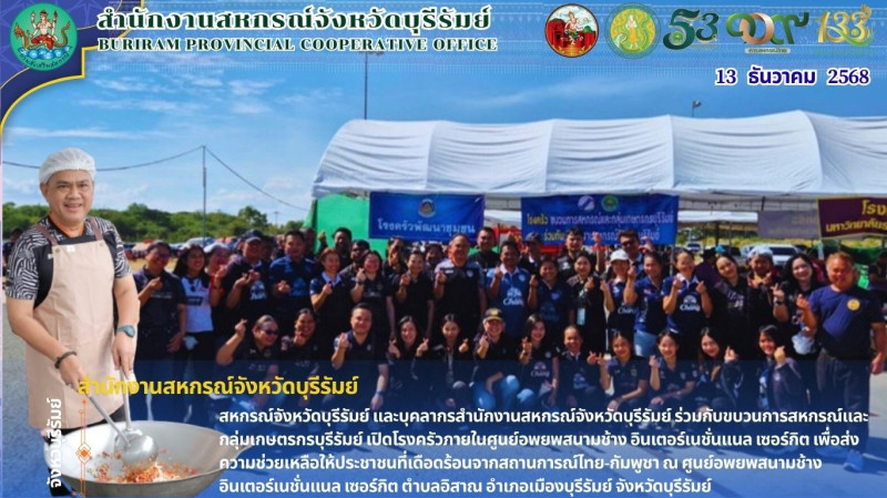 วันเสาร์ที่ 12 ธันวาคม 2568 นายทวีภัทร เหล่าบรรเทา สหกรณ์จังหวัดบุรีรัมย์ ร่วมกับบุคลากรสำนักงานสหกรณ์จังหวัดบุรีรัมย์ และขบวนการสหกรณ์/กลุ่มเกษตรกรบุรีรัมย์ จัดตั้งโรงครัว เพื่อจัดทำข้าวกะเพราไก่ ไข่ต้ม จำนวน 600 กล่อง เพื่อให้ความช่วยเหลือด้านอาหารแก่ประชาชนที่เดือดร้อนจากสถานการณ์ไทย-กัมพูชา ณ ศูนย์อพยพสนามช้าง อินเตอร์เนชั่นแนล เซอร์กิต ตำบลอิสาณ อำเภอเมืองบุรีรัมย์ จังหวัดบุรีรัมย์