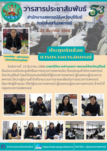วันอังคารที่ 23 ธันวาคม 2568 นายทวีภัทร เหล่าบรรเทา สหกรณ์จังหวัดบุรีรัมย์ เป็นประธานเปิดประชุมซักซ้อมการตรวจการสหกรณ์ ณ ห้องประชุมสำนักงานสหกรณ์จังหวัดบุรีรัมย์ โดยมีวัตถุประสงค์เพื่อให้ผู้ตรวจการหสกรณ์ ผู้ช่วยคณะผู้ตรวจการสหกรณ์ มีความรู้ความเข้าใจถึงกระบวนการรายละเอียดในการตรวจการสหกรณ์ มีสมาชิกผู้เข้าอบรม ได้แก่ ผู้ตรวจการสหกรณ์ ผู้ช่วยคณะผู้ตรวจการสหกรณ์ เจ้าหน้าที่กลุ่มตรวจการณ์สหกรณ์