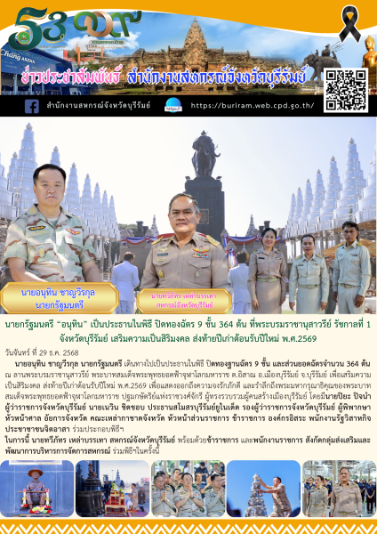 วันจันทร์ ที่ 29 ธ.ค. 2568 นายอนุทิน ชาญวีรกุล นายกรัฐมนตรี เดินทางไปเป็นประธานในพิธี ปิดทองฐานฉัตร 9 ชั้น และส่วนยอดฉัตรจำนวน 364 ต้น ณ ลานพระบรมราชานุสาวรีย์ พระบาทสมเด็จพระพุทธยอดฟ้าจุฬาโลกมหาราช ต.อิสาณ อ.เมืองบุรีรัมย์ จ.บุรีรัมย์ เพื่อเสริมความเป็นสิริมงคล ส่งท้ายปีเก่าต้อนรับปีใหม่ พ.ศ.2569 เพื่อแสดงออกถึงความจงรักภักดี และรำลึกถึงพระมหากรุณาธิคุณของพระบาทสมเด็จพระพุทธยอดฟ้าจุฬาโลกมหาราช ปฐมกษัตริย์แห่งราชวงศ์จักรี ผู้ทรงรวบรวมผู้คนสร้างเมืองบุรีรัมย์ โดยมีนายปิยะ ปิจนำ ผู้ว่าราชการจังหวัดบุรีรัมย์ นายเนวิน ชิดชอบ ประธานสโมสรบุรีรัมย์ยูไนเต็ด รองผู้ว่าราชการจังหวัดบุรีรัมย์ ผู้พิพากษาหัวหน้าศาล อัยการจังหวัด คณะเหล่ากาชาดจังหวัด หัวหน้าส่วนราชการ ข้าราชการ องค์กรอิสระ พนักงานรัฐวิสาหกิจ ประชาชาชนจิตอาสา ร่วมประกอบพิธีฯ
