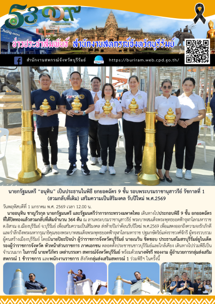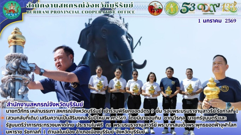 วันพฤหัสบดีที่ 1 มกราคม พ.ศ. 2569 เวลา 12.00 น. นายอนุทิน ชาญวีรกุล นายกรัฐมนตรี และรัฐมนตรีว่าการกระทรวงมหาดไทย เดินทางไปประกอบพิธี 9 ชั้น ยกยอดฉัตรที่ได้ปิดทองแล้วสวมกลับที่เดิมจำนวน 364 ต้น ณ ลานพระบรมราชานุสาวรีย์ พระบาทสมเด็จพระพุทธยอดฟ้าจุฬาโลกมหาราช ต.อิสาณ อ.เมืองบุรีรัมย์ จ.บุรีรัมย์ เพื่อเสริมความเป็นสิริมงคล ส่งท้ายปีเก่าต้อนรับปีใหม่ พ.ศ.2569 เพื่อแสดงออกถึงความจงรักภักดี และรำลึกถึงพระมหากรุณาธิคุณของพระบาทสมเด็จพระพุทธยอดฟ้าจุฬาโลกมหาราช ปฐมกษัตริย์แห่งราชวงศ์จักรี ผู้ทรงรวบรวมผู้คนสร้างเมืองบุรีรัมย์ โดยมีนายปิยะ ปิจนำ ผู้ว่าราชการจังหวัดบุรีรัมย์ นายเนวิน ชิดชอบ ประธานสโมสรบุรีรัมย์ยูไนเต็ด รองผู้ว่าราชการจังหวัด หัวหน้าส่วนราชการ ภาคเอกชน ตลอดตั้งประชาชนชาวบุรีรัมย์และใกล้เคียง เดินทางไปร่วมพิธีร่วมพิธีเป็นจำนวนมาก