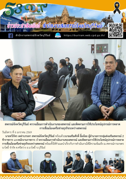 วันที่ 6 มกราคม 2569 นายทวีภัทร เหล่าบรรเทา สหกรณ์จังหวัดบุรีรัมย์ พร้อมด้วยนายเสริมศักดิ์ ยิ้มน้อย ผู้อำนวยการกลุ่มส่งเสริมสหกรณ์ 2 และข้าราชการ พนักงานราชการ เข้าตรวจเยี่ยมการดำเนินงานของสหกรณ์ และติดตามการใช้ประโยชน์อุปกรณ์การตลาด การเชื่อมโยงเครือข่ายธุรกิจระหว่างสหกรณ์ พร้อมทั้งให้คำแนะนำเกี่ยวกับการดำเนินงานให้มีความเข้มแข็ง ณ สหกรณ์การเกษตรนาโพธิ์ จำกัด ต.ศรีสว่าง อ.นาโพธิ์ จ.บุรีรัมย์
