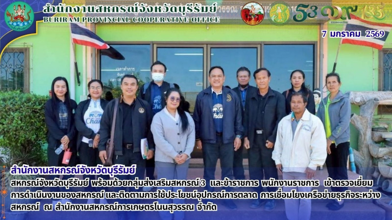 วันที่ 7 มกราคม 2569 นายทวีภัทร เหล่าบรรเทา สหกรณ์จังหวัดบุรีรัมย์ พร้อมด้วยรกลุ่มส่งเสริมสหกรณ์ 3 และข้าราชการ พนักงานราชการ เข้าตรวจเยี่ยมการดำเนินงานของสหกรณ์ และติดตามการใช้ประโยชน์อุปกรณ์การตลาด การเชื่อมโยงเครือข่ายธุรกิจระหว่างสหกรณ์ พร้อมทั้งให้คำแนะนำเกี่ยวกับการดำเนินงานให้มีความเข้มแข็ง ณ สำนักงานสหกรณ์การเกษตรโนนสุวรรณ จำกัด อ.โนนสุวรรณ จ.บุรีรัมย์