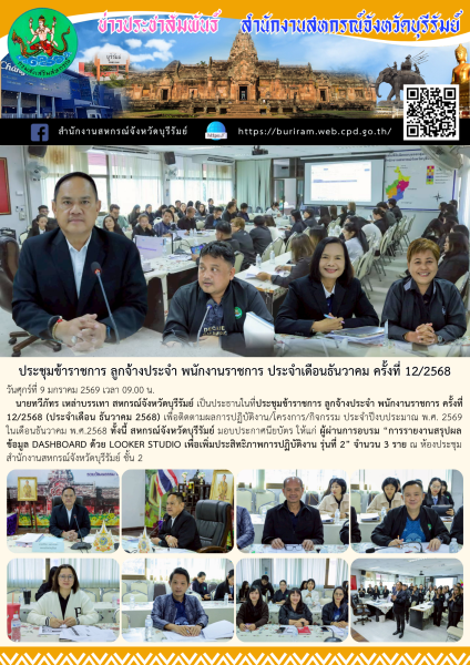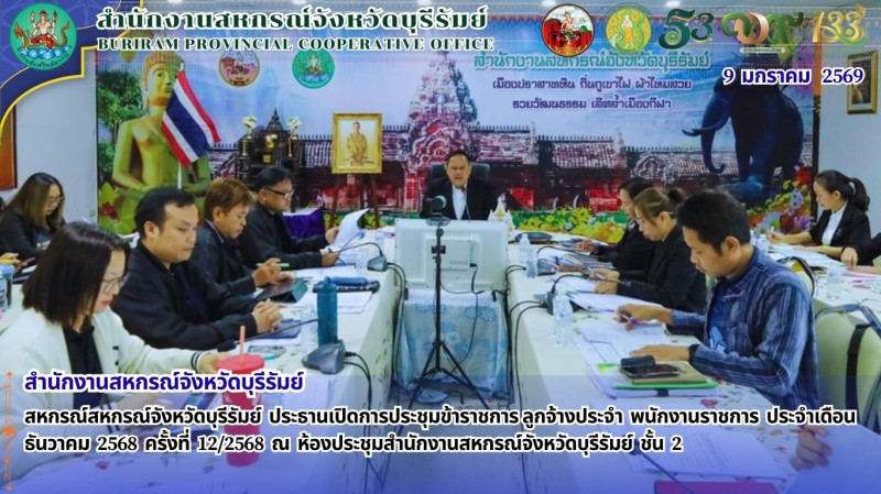 วันศุกร์ที่ 9 มกราคม 2569 เวลา 09.00 น. นายทวีภัทร เหล่าบรรเทา สหกรณ์จังหวัดบุรีรัมย์ เป็นประธานในที่ประชุมข้าราชการ ลูกจ้างประจำ พนักงานราชการ ครั้งที่ 12/2568 (ประจำเดือน ธันวาคม 2568) เพื่อติดตามผลการปฏิบัติงาน/โครงการ/กิจกรรม ประจำปีงบประมาณ พ.ศ. 2569 ในเดือนธันวาคม พ.ศ.2568