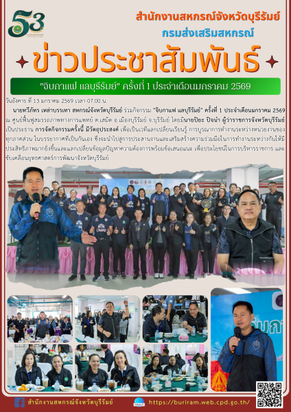 วันอังคารที่ 13 มกราคม 2569 เวลา 07.00 น. นายทวีภัทร เหล่าบรรเทา สหกรณ์จังหวัดบุรีรัมย์ ร่วมกิจกรรม "จิบกาแฟ แลบุรีรัมย์" ครั้งที่ 1 ประจำเดือนมกราคม 2569 ณ ศูนย์ฟื้นฟูสมรรถภาพทางการแพทย์ ต.เสม็ด อ.เมืองบุรีรัมย์ จ.บุรีรัมย์ โดยมีนายปิยะ ปิจนำ ผู้ว่าราชการจังหวัดบุรีรัมย์ เป็นประธาน การจัดกิจกรรมครั้งนี้ มีวัตถุประสงค์ เพื่อเป็นเวทีแลกเปลี่ยนเรียนรู้ การบูรณาการทำงานระหว่างหน่วยงานของทุกภาคส่วน ในบรรยากาศที่เป็นกันเอง ซึ่งจะนำไปสู่การประสานงานและเสริมสร้างความร่วมมือในการทำงานระหว่างกันให้มีประสิทธิภาพมากยิ่งขึ้นและแลกเปลี่ยนข้อมูลปัญหาความต้องการพร้อมข้อเสนอแนะ เพื่อประโยชน์ในการบริหารราชการ และขับเคลื่อนยุทธศาสตร์การพัฒนาจังหวัดบุรีรัมย์
