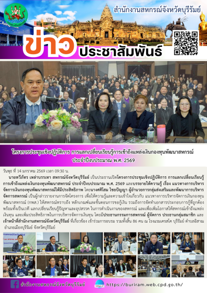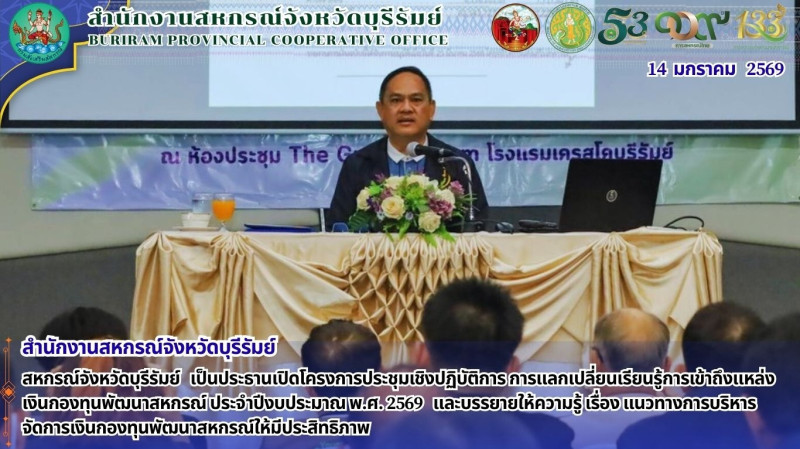 วันพุธ ที่ 14 มกราคม 2569 เวลา 09:30 น. นายทวีภัทร เหล่าบรรเทา สหกรณ์จังหวัดบุรีรัมย์ เป็นประธานเปิดโครงการประชุมเชิงปฏิบัติการ การแลกเปลี่ยนเรียนรู้การเข้าถึงแหล่งเงินกองทุนพัฒนาสหกรณ์ ประจำปีงบประมาณ พ.ศ. 2569 และบรรยายให้ความรู้ เรื่อง แนวทางการบริหารจัดการเงินกองทุนพัฒนาสหกรณ์ให้มีประสิทธิภาพ โดยนางศศิโสม ไชยปัญญา ผู้อำนวยการกลุ่มส่งเสริมและพัฒนาการบริหารจัดการสหกรณ์ เป็นผู้กล่าวรายงานการจัดโครงการ เพื่อให้ความรู้และความเข้าใจเกี่ยวกับ แนวทางการบริหารจัดการเงินกองทุนพัฒนาสหกรณ์ (กพส.) ให้สหกรณ์ทราบถึง หลักเกณฑ์และขั้นตอนการขอกู้เงิน รวมถึงการจัดทำเอกสารประกอบการกู้ที่ถูกต้อง พร้อมทั้งเป็นเวที แลกเปลี่ยนเรียนรู้ปัญหาและอุปสรรค ในการดำเนินงานของสหกรณ์ และเพิ่มโอกาสให้สหกรณ์เข้าถึงแหล่งเงินทุนและเพิ่มประสิทธิภาพในการบริหารจัดการเงินทุน โดยมีประธานกรรมการสหกรณ์ ผู้จัดการ ประธานกลุ่มสมาชิก และเจ้าหน้าที่สำนักงานสหกรณ์จังหวัดบุรีรัมย์ ที่เกี่ยวข้อง เข้าร่วมการอบรม รวมทั้งสิ้น 86 คน ณ โรงแรมเครสโค บุรีรัมย์ ตำบลอิสาณ อำเภอเมืองบุรีรัมย์ จังหวัดบุรีรัมย์