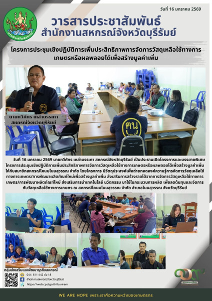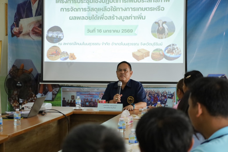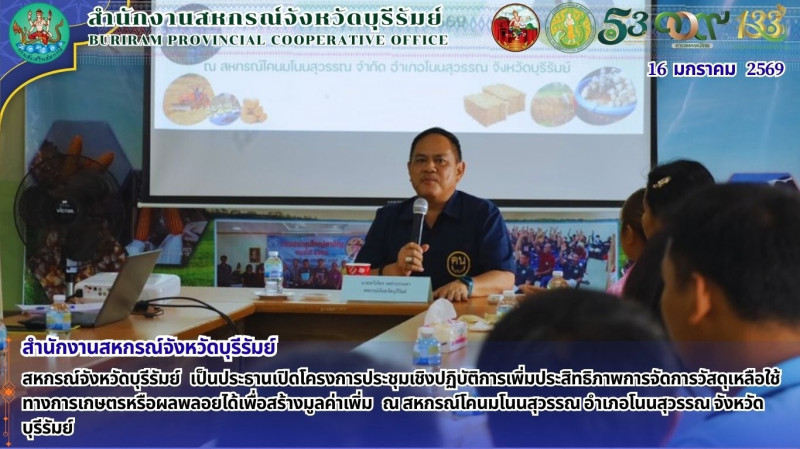 วันที่ 16 มกราคม 2569 นายทวีภัทร เหล่าบรรเทา สหกรณ์จังหวัดบุรีรัมย์ เป็นประธานเปิดโครงการและบรรยายพิเศษโครงการประชุมเชิงปฏิบัติการเพิ่มประสิทธิภาพการจัดการวัสดุเหลือใช้ทางการเกษตรหรือผลพลอยได้เพื่อสร้างมูลค่าเพิ่ม ให้กับสมาชิกสหกรณ์โคนมโนนสุวรรณ จำกัด โดยโครงการมีวัตถุประสงค์เพื่อถ่ายทอดองค์ความรู้การจัดการวัสดุเหลือใช้ทางการเกษตร/การพัฒนาผลิตภัณฑ์ใหม่เพื่อสร้างมูลค่าเพิ่ม ส่งเสริมการสร้างรายได้จากการจัดการวัสดุเหลือใช้ทางการเกษตร/การพัฒนาผลิตภัณฑ์ใหม่ ส่งเสริมการนำเทคโนโลยี นวัตกรรม มาใช้ในกระบวนการผลิต เพื่อลดต้นทุนและจัดการกับวัสดุเหลือใช้ทางการเกษตร ณ สหกรณ์โคนมโนนสุวรรณ อำเภอโนนสุวรรณ จังหวัดบุรีรัมย์