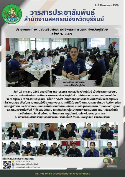 วันที่ 29 มกราคม 2569 นายทวีภัทร เหล่าบรรเทา สหกรณ์จังหวัดบุรีรัมย์ เป็นประธานการประชุมคณะทำงานส่งเสริมพัฒนาอาชีพและการตลาด จังหวัดบุรีรัมย์ ภายใต้คณะอนุกรรมการนโยบายที่ดินจังหวัดบุรีรัมย์ (คทช.จังหวัดบุรีรัมย์) ครั้งที่ 1/2569 โดยมีคณะทำงานจากส่วนราชการในจังหวัดบุรีรัมย์เข้าร่วมประชุม เพื่อรับทราบแผนปฏิบัติงานและงบประมาณที่ได้รับอนุมัติจากส่วนกลาง กำหนด Action plan การปฏิบัติงาน และติดตามงานในแต่ละพื้นที่ รวมทั้งกำหนดกิจกรรมหลักสูตรการอบรม ถ่ายทอดความรู้ของแต่ละหน่วยงานในพื้นที่ที่ได้รับอนุมัติแผน และคัดเลือกกลุ่มเป้าหมายที่จะดำเนินการ (คน/แปลง/พื้นที่) และจัดทำแผนส่งเสริมพัฒนาอาชีพและสาธารณูปโภคร่วมกับหน่วยงานบูรณาการ ณ ณ ห้องประชุมสำนักงานสหกรณ์จังหวัดบุรีรัมย์ ชั้น 2 อำเภอเมืองบุรีรัมย์ จังหวัดบุรีรัมย์