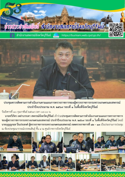 วันอังคารที่ ๑๐ กุมภาพันธ์ ๒๕๖๙ เวลา ๐๙.๐๐ น. นายทวีภัทร เหล่าบรรเทา สหกรณ์จังหวัดบุรีรัมย์ เข้าร่วมประชุมตรวจติดตามการดำเนินงานตามแผนการตรวจราชการ ของผู้ตรวจราชการกระทรวงเกษตรและสหกรณ์ ประจำปีงบประมาณ พ.ศ. ๒๕๖๙ รอบที่ ๑ ในพื้นที่จังหวัดบุรีรัมย์ โดยมีนายบุญญกฤช ปิ่นประสงค์ ผู้ตรวจราชการกระทรวงเกษตรและสหกรณ์ เขตตรวจราชการที่ ๑๒ – ๑๓ เป็นประธานการประชุม ณ ห้องประชุมนารายณ์บรรทมสินธุ์ ชั้น ๔ ศูนย์ราชการจังหวัดบุรีรัมย์