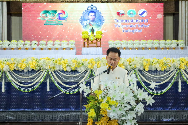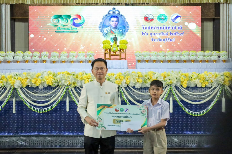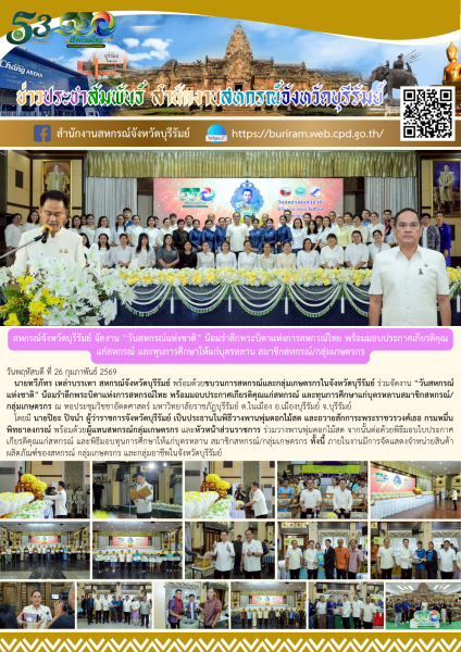 วันพฤหัสบดี ที่ 26 กุมภาพันธ์ 2569 นายทวีภัทร เหล่าบรรเทา สหกรณ์จังหวัดบุรีรัมย์ พร้อมด้วยขบวนการสหกรณ์และกลุ่มเกษตรกรในจังหวัดบุรีรัมย์ ร่วมจัดงาน “วันสหกรณ์แห่งชาติ” น้อมรำลึกพระบิดาแห่งการสหกรณ์ไทย พร้อมมอบประกาศเกียรติคุณแก่สหกรณ์ และทุนการศึกษาแก่บุตรหลานสมาชิกสหกรณ์/กลุ่มเกษตรกร ณ หอประชุมวิชชาอัตตศาสตร์ มหาวิทยาลัยราชภัฏบุรีรัมย์ ต.ในเมือง อ.เมืองบุรีรัมย์ จ.บุรีรัมย์ โดยมี นายปิยะ ปิจนำ ผู้ว่าราชการจังหวัดบุรีรัมย์ เป็นประธานในพิธีวางพานพุ่มดอกไม้สด และถวายสักการะพระราชวรวงศ์เธอ กรมหมื่นพิทยาลงกรณ์ พร้อมด้วยผู้แทนสหกรณ์กลุ่มเกษตรกร และหัวหน้าส่วนราชการ ร่วมวางพานพุ่มดอกไม้สด จากนั้นต่อด้วยพิธีมอบใบประกาศเกียรติคุณแก่สหกรณ์ และพิธีมอบทุนการศึกษาให้แก่บุตรหลาน สมาชิกสหกรณ์/กลุ่มเกษตรกร ทั้งนี้ ภายในงานมีการจัดแสดงจำหน่ายสินค้าผลิตภัณฑ์ของสหกรณ์ กลุ่มเกษตรกร และกลุ่มอาชีพในจังหวัดบุรีรัมย์