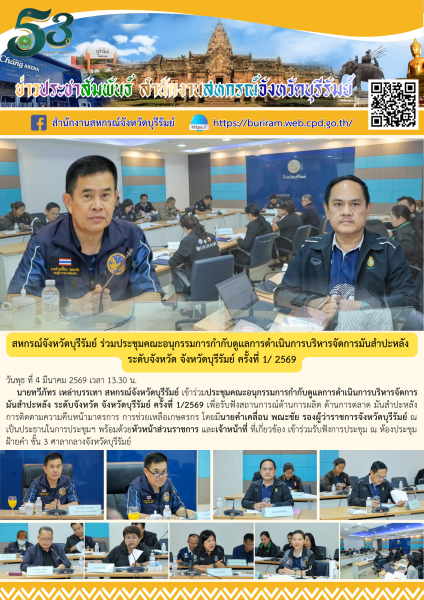 วันพุธ ที่ 4 มีนาคม 2569 เวลา 13.30 น. นายทวีภัทร เหล่าบรรเทา สหกรณ์จังหวัดบุรีรัมย์ เข้าร่วมประชุมคณะอนุกรรมการกำกับดูแลการดำเนินการบริหารจัดการมันสำปะหลัง ระดับจังหวัด จังหวัดบุรีรัมย์ ครั้งที่ 1/2569 เพื่อรับฟังสถานการณ์ด้านการผลิต ด้านการตลาด มันสำปะหลัง การติดตามความคืบหน้ามาตรการ การช่วยเหลือเกษตรกร โดยมีนายคําเคลื่อน พณะชัย รองผู้ว่าราชการจังหวัดบุรีรัมย์ ณ เป็นประธานในการประชุมฯ พร้อมด้วยหัวหน้าส่วนราชการ และเจ้าหน้าที่ ที่เกี่ยวข้อง เข้าร่วมรับฟังการประชุม ณ ห้องประชุมฝ้ายคำ ชั้น 3 ศาลากลางจังหวัดบุรีรัมย์