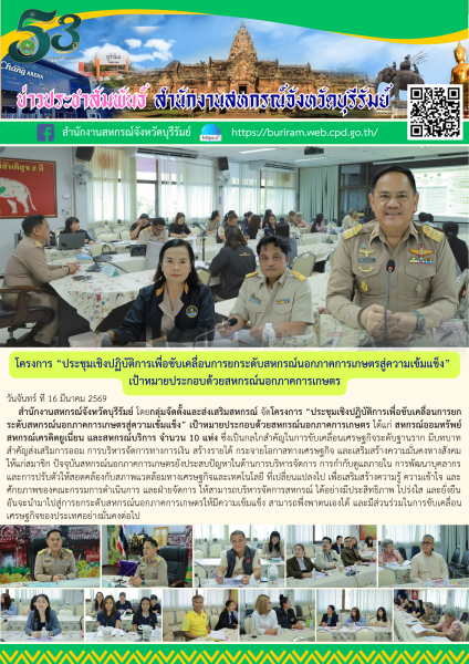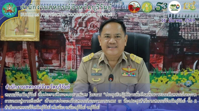 วันจันทร์ที 16 มีนาคม 2569 สำนักงานสหกรณ์จังหวัดบุรีรัมย์ โดยกลุ่มจัดตั้งและส่งเสริมสหกรณ์ จัดโครงการ “ประชุมเชิงปฏิบัติการเพื่อขับเคลื่อนการยกระดับสหกรณ์นอกภาคการเกษตรสู่ความเข้มแข็ง” เป้าหมายประกอบด้วยสหกรณ์นอกภาคการเกษตร ได้แก่ สหกรณ์ออมทรัพย์ สหกรณ์เครดิตยูเนี่ยน และสหกรณ์บริการ จำนวน 10 แห่ง ซึ่งเป็นกลไกสำคัญในการขับเคลื่อนเศรษฐกิจระดับฐานราก มีบทบาทสำคัญส่งเสริมการออม การบริหารจัดการทางการเงิน สร้างรายได้ กระจายโอกาสทางเศรษฐกิจ และเสริมสร้างความมั่นคงทางสังคมให้แก่สมาชิก ปัจจุบันสหกรณ์นอกภาคการเกษตรยังประสบปัญหาในด้านการบริหารจัดการ การกำกับดูแลภายใน การพัฒนาบุคลากร และการปรับตัวให้สอดคล้องกับสภาพแวดล้อมทางเศรษฐกิจและเทคโนโลยี ที่เปลี่ยนแปลงไป เพื่อเสริมสร้างความรู้ ความเข้าใจ และศักยภาพของคณะกรรมการดำเนินการ และฝ่ายจัดการ ให้สามารถบริหารจัดการสหกรณ์ ได้อย่างมีประสิทธิภาพ โปร่งใส และยั่งยืน อันจะนำมาไปสู่การยกระดับสหกรณ์นอกภาคการเกษตรให้มีความเข้มแข็ง สามารถพึ่งพาตนเองได้ และมีส่วนร่วมในการขับเคลื่อนเศรษฐกิจของประเทศอย่างมั่นคงต่อไป