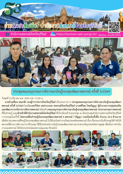 วันพุธที่ 25 มีนาคม พ.ศ. 2569 เวลา 13.30 น. นายคำเคลื่อน พณะชัย รองผู้ว่าราชการจังหวัดบุรีรัมย์ เป็นประธานการประชุมคณะอนุกรรมการพิจารณาเงินกู้กองทุนพัฒนาสหกรณ์ ครั้งที่ 5/2569 โดยมีนายทวีภัทร เหล่าบรรเทา สหกรณ์จังหวัดบุรีรัมย์ นางศศิโสม ไชยปัญญา ผู้อำนวยการกลุ่มส่งเสริมและพัฒนาการบริหารการจัดการสหกรณ์ พร้อมด้วยคณะอนุกรรมการพิจารณาเงินกู้กองทุนพัฒนาสหกรณ์ ประธานกรรมการสหกรณ์ ที่ยื่นคำขอกู้ และเจ้าหน้าที่สำนักงานสหกรณ์จังหวัดบุรีรัมย์ ที่เกี่ยวข้องเข้าร่วมประชุม ณ ห้องประชุมสำนักงานสหกรณ์จังหวัดบุรีรัมย์ ชั้น 2 สำนักงานสหกรณ์จังหวัดบุรีรัมย์ ตำบลในเมือง อำเภอเมืองบุรีรัมย์ จังหวัดบุรีรัมย์