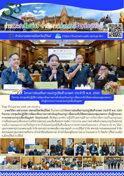 วันพุธที่ 8 เมษายน 2569 นายทวีภัทร เหล่าบรรเทา สหกรณ์จังหวัดบุรีรัมย์ ประธานเปิดและบรรยายพิเศษ โครงการส่งเสริมการแปรรูปสินค้าเกษตร ประจำปี พ.ศ. 2569 กิจกรรม ประชุมเชิงปฏิบัติการพัฒนาศักยภาพการดำเนินธุรกิจแปรรูปเพื่อยกระดับให้สหกรณ์และกลุ่มเกษตรกรเป็นผู้ประกอบการเกษตรแปรรูปเพื่อเพิ่มมูลค่า วัตถุประสงค์ เพื่อพัฒนาองค์ความรู้ให้กับสหกรณ์ด้านการบริหารจัดการธุรกิจแปรรูปและการเชื่อมโยงแลกเปลี่ยนระหว่างเครือข่ายสหกรณ์ และเพื่อเชื่อมโยงการผลิต การรวบรวม และการตลาดสินค้าเกษตรแปรรูปในสหกรณ์ รวมถึงวางแผนแนวทางแก้ไขปัญหาราคาน้ำมันและปุ๋ยเคมีอันสืบเนื่องมาจากสงครามตะวันออกกลาง เป้าหมาย 80 คน ได้แก่บุคลากรสหกรณ์การเกษตรกระสัง จำกัด สหกรณ์การเกษตรเพื่อการตลาดลูกค้า ธ.ก.ส.บุรีรัมย์ จำกัด สหกรณ์การเกษตรหนองหงส์ จำกัด สหกรณ์และกลุ่มเกษตรกรเครือข่าย เจ้าหน้าที่ส่งเสริมสหกรณ์ เจ้าหน้าที่และผู้สังเกตการณ์ ณ โรงแรมสกาย วิว รีสอร์ท บุรีรัมย์ ตำบลเสม็ด อำเภอเมืองบุรีรัมย์ จังหวัดบุรีรัมย์