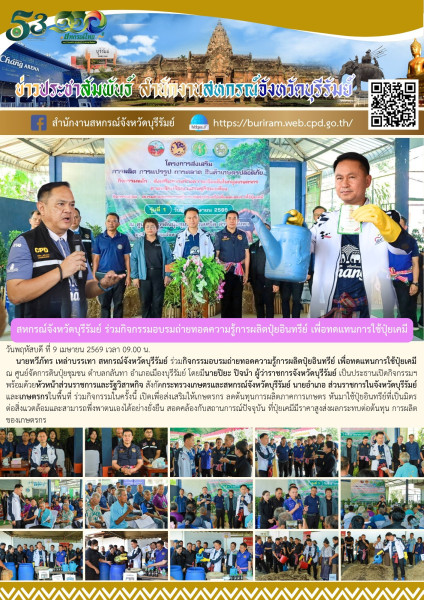 วันพฤหัสบดี ที่ 9 เมษายน 2569 เวลา 09.00 น. นายทวีภัทร เหล่าบรรเทา สหกรณ์จังหวัดบุรีรัมย์ เข้าร่วมกิจกรรมอบรมถ่ายทอดความรู้การผลิตปุ๋ยอินทรีย์ เพื่อทดแทนการใช้ปุ๋ยเคมี ณ ศูนย์จัดการดินปุ๋ยชุมชน ตำบลกลันทา อำเภอเมืองบุรีรัมย์ โดยมีนายปิยะ ปิจนำ ผู้ว่าราชการจังหวัดบุรีรัมย์ เป็นประธานเปิดกิจกรรม ฯ พร้อมด้วยหัวหน้าส่วนราชการและรัฐวิสาหกิจ สังกัดกระทรวงเกษตรและสหกรณ์จังหวัดบุรีรัมย์ นายอำเภอ ส่วนราชการในจังหวัดบุรีรัมย์ และเกษตรกรในพื้นที่ ร่วมกิจกรรมในครั้งนี้ เปิดเพื่อส่งเสริมให้เกษตรกร ลดต้นทุนการผลิตภาคการเกษตร หันมาใช้ปุ๋ยอินทรีย์ที่เป็นมิตรต่อสิ่งแวดล้อมและสามารถพึ่งพาตนเองได้อย่างยั่งยืน สอดคล้องกับสถานการณ์ปัจจุบัน ที่ปุ๋ยเคมีมีราคาสูงส่งผลกระทบต่อต้นทุน การผลิตของเกษตรกร