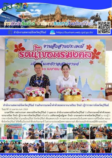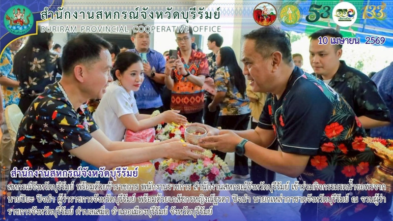 วันศุกร์ที่ 10 เมษายน พ.ศ. 2569 นายทวีภัทร เหล่าบรรเทา สหกรณ์จังหวัดบุรีรัมย์ พร้อมด้วยข้าราชการ พนักงานราชการ สำนักงานสหกรณ์จังหวัดบุรีรัมย์ เข้าร่วมกิจกรรมรดน้ำขอพรจากนายปิยะ ปิจนำ ผู้ว่าราชการจังหวัดบุรีรัมย์ พร้อมด้วยเภสัชกรหญิงณัฐรดา ปิจนำ นายกเหล่ากาชาดจังหวัดบุรีรัมย์ ณ จวนผู้ว่าราชการจังหวัดบุรีรัมย์ อำเภอเมืองบุรีรัมย์ จังหวัดบุรีรัมย์ เพื่อแสดงความรัก ความเคารพ และขอพรเนื่องในเทศกาลสงกรานต์ปีใหม่ไทย ๒๕๖๙ ซึ่งจังหวัดบุรีรัมย์ ได้จัดขึ้นเป็นประจำสืบต่อกันมาทุกปี ในช่วงงานประเพณีเทศกาลสงกรานต์ เพื่อร่วมอนุรักษ์ประเพณีที่ดีงามของไทย