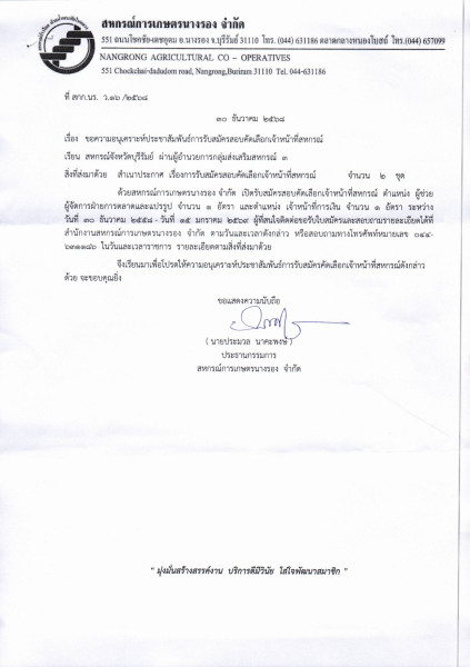 ผู้สนใจติดต่อขอรับใบสมัครและสอบถามรายละเอียดได้ที่ สำนักงานสหกรณ์การเกษตรนางรอง จำกัด เลขที่ 551 ถนนโชคชัย - เดชอุดม อ.นางรอง จ.บุรีรัมย์ โทรศัพท์ 044-631186 ในวันและเวลาราชการ