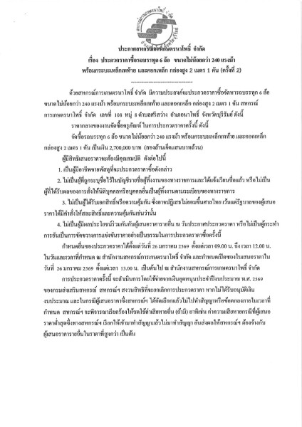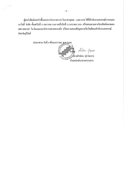 กำหนดยื่นซองประกวดราคา ได้ตั้งแต่วันที่ 26 มกราคม 2569 ตั้งแต่เวลา 09.00 - 12.00 น. ณ สหกรณ์การเกษตรนาโพธิ์ จำกัด เลขที่ 108 หมู่ 8 ตำบลศรีสว่าง อำเภอนาโพธิ์ จังหวัดบุรีรัมย์