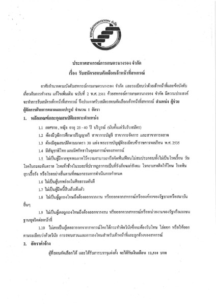 ประกาศสหกรณ์การเกษตรนางรอง จำกัด เรื่อง รับสมัครบุคคลเพื่อสอบคัดเลือกเจ้าหน้าที่สหกรณ์ ตำแหน่ง ผู้ช่วยผู้จัดการฝ่ายการตลาดและแปรรูป จำนวน 1 อัตรา และตำแหน่ง เจ้าหน้าที่การเงิน จำนวน 1 อัตรา