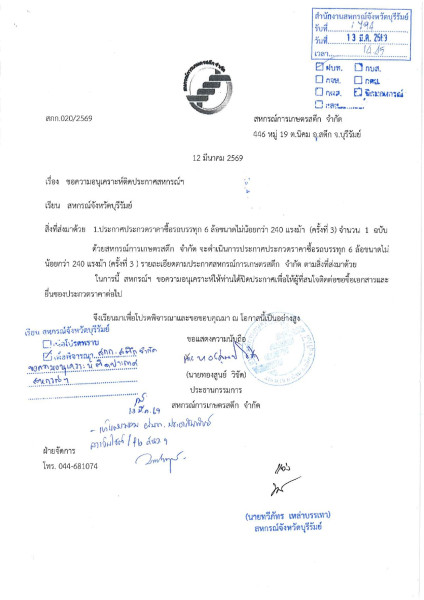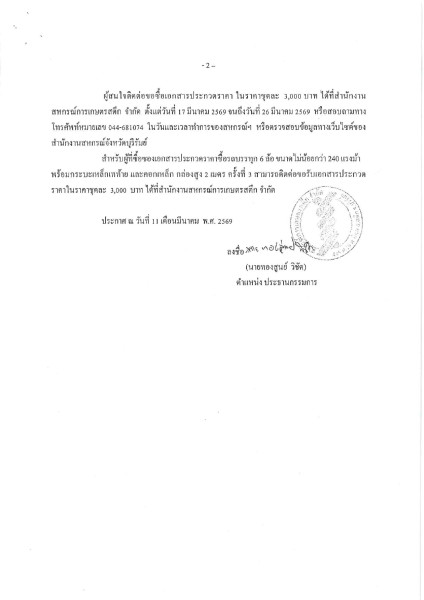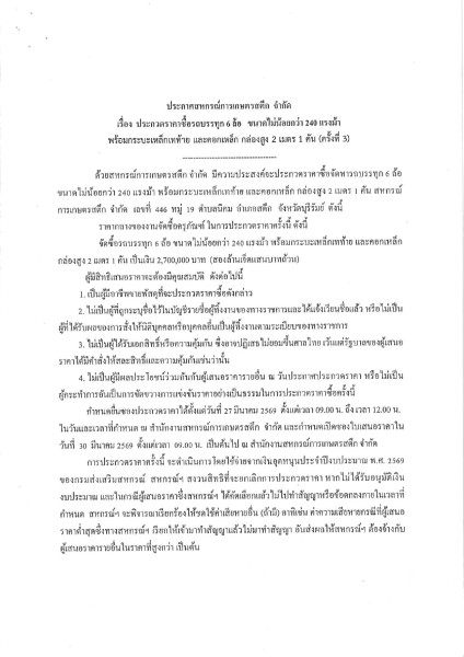 ประกาศ สหกรณ์การเกษตรสตึก จำกัด เรื่อง ประกวดราคาซื้อรถบรรทุก 6 ล้อ ขนาดไม่น้อยกว่า 240 แรงม้า (ครั้งที่ 3) กำหนดยื่นซองประกวดราคา ได้ตั้งแต่วันที่ 27 มีนาคม 2569 ตั้งแต่เวลา 09.00 - 12.00 น. ณ สหกรณ์การเกษตรสตึก จำกัด เลขที่ 446 หมู่ 19 ตำบลนิคม อำเภอสตึก จังหวัดบุรีรัมย์ กำหนดเปิดซองใบเสนอราคา ในวันที่ 30 มีนาคม 2569 ตั้งแต่เวลา 09.00 น. เป็นต้นไป ณ สหกรณ์การเกษตรสตึก จำกัด เลขที่ 446 หมู่ 19 ตำบลนิคม อำเภอสตึก จังหวัดบุรีรัมย์อ สามารถติดต่อซื้อเอกสารสอบราคาได้ ตั้้งแต่วันที่ 17 มีนาคม 2569 จนถึงวันที่ 26 มีนาคม 2569 ที่ฝ่ายธุรการ สหกรณ์การเกษตรสตึก จำกัด เลขที่ 446 หมู่ 19 ตำบลนิคม อำเภอสตึก จังหวัดบุรีรัมย์ สนใจติดต่อสอบถามทางโทรศัพท์ 044-681-074 ในวันเวลาราชการ ประกาศ ณ วันที่ 11 มีนาคม 2569