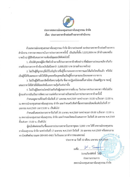 #กำหนดเปิดซองใบเสนอราคา ในวันที่ 28 เมษายน 2569ตั้งแต่เวลา 13.00 น. เป็นต้นไป ณ สหกรณ์กองทุนสวนยางโนนสุวรรณ จำกัด เลขที่ 109 หมู่ 5 ถนนดงบัง - ม่วงงาม ตำบลดงอีจาน อำเภอโนนสุวรรณ จังหวัดบุรีรัมย์